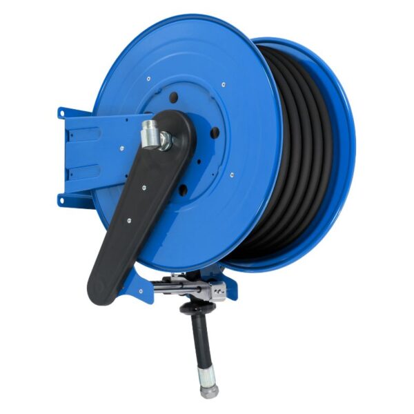 Der Schlauchaufroller hat ein Drehgelenk, das einem Druck von bis zu 100 bar standhält.