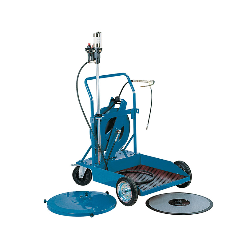 Kit di alimentazione pneumatica mobile per fusti da 180 kg su carrello pesante a 4 ruote. Caratteristiche: pressione di uscita massima di 400 bar, erogazione di 2400 g/min, pompa pneumatica per grasso 50:1, regolatore di pressione, filtro dell’aria, avvolgitubo con tubo ad alta pressione da 15 m, tubo di collegamento da 2 m, pistola per l’erogazione di grasso ad alta pressione da 300 mm, piastra seguitore (ø 590-540 mm), coperchio del fusto in metallo (ø 600-560 mm). Dimensioni: 900x1030x1400 mm.