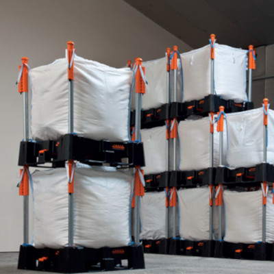 Il sistema di movimentazione e stoccaggio Big bag di Indus Neva è un sistema unico per un facile riempimento, un trasporto interno ed esterno sicuro, un efficiente stoccaggio in pila e un facile scarico (con possibilità di dosaggio e taglio attraverso lo scivolo) di solidi confezionati in big bags / FIBC.