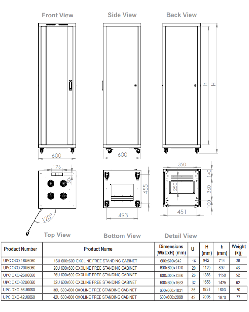 27 pezzi di Upcom Armadio rack free standing Oxoline per apparecchiature di rete. Disponibile in due colori. Armadio rack con capacità fino a 42U, ingresso cavi dall’alto e dal basso, per uso interno.