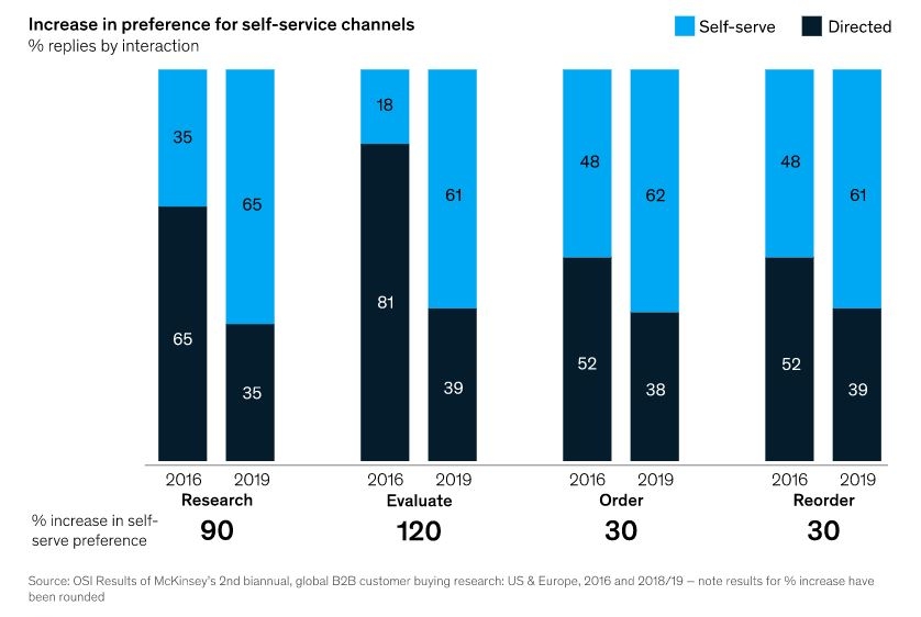Sebbene alcune transazioni B2B rimangano ancora oggi così complesse, il processo sta cambiando, grazie al fatto che nella maggior parte dei casi il modo più semplice per raccogliere informazioni ed effettuare ricerche sui prodotti è online. Una ricerca condotta da McKinsey mostra un rapido spostamento verso la preferenza per i canali self-service. È quindi sempre più importante semplificare il percorso di acquisto online per il cliente fornendo buone dimostrazioni di prodotti, visualizzando tutti i dati rilevanti e rendendo i prodotti B2B facilmente acquistabili online.