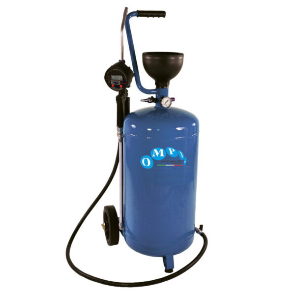 Мобильный опрыскиватель объемом 40 л из окрашенной стали на двух колесах с жестким отводом и автоматической противокапельной форсункой, емкость 40 л, максимальное давление на входе 5 бар, оснащен индикатором уровня, манометром, широкой заливной воронкой, резиновым шлангом 1,6 м, электронным цифровым расходомером — размеры (ДхШхГ) мм 380x400x1010