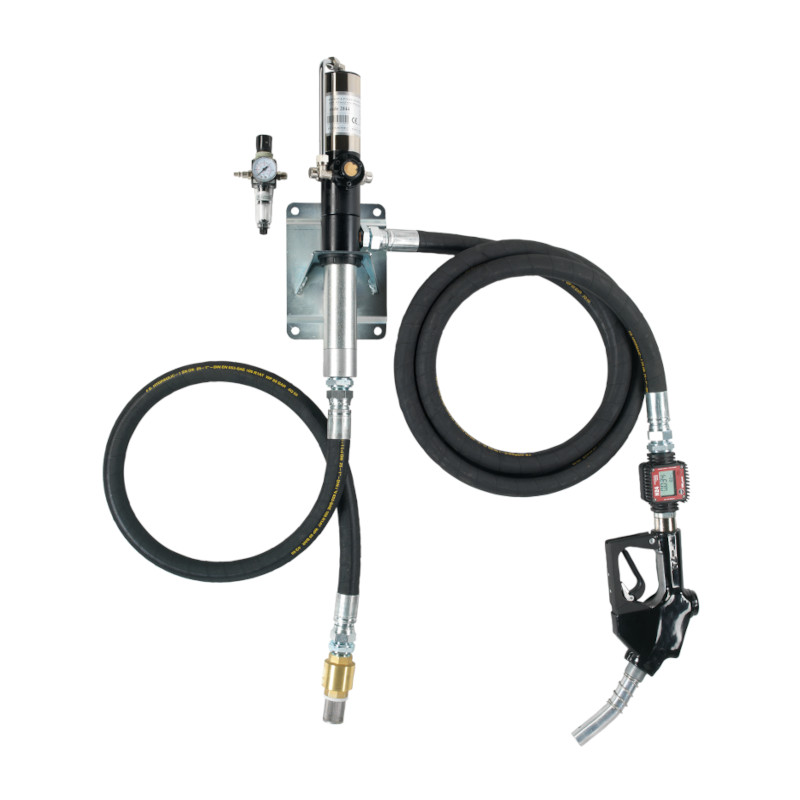 Пневматический комплект для перекачки дизельного топлива — 35 л/мин состоит из поршневого насоса 1:1, настенного кронштейна, регулятора давления, влагоотделителя воздушного фильтра, 1,5 метра резинового всасывающего шланга 1″ BSP, ножного клапана, фильтра, электронного расходомера в линии, 4 метров резинового напорного шланга 3/4″, автоматического запорного дозатора с поворотным входом — максимальное давление на выходе 8 бар — соединение 3/4″ BSP